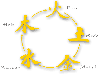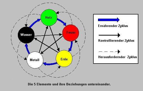 Das System der 5 Wandlungsphasen oder 5 Elemente. Sheng- (fördernden-) und Ke (Hemmungs)-Zyklus